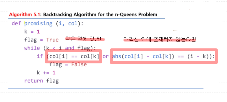 - col[i] == col[k] : 같은 열에 놓이게 되므로, 유망하지 않다.
