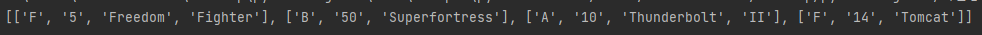 출력: ["A-10 Thunderbolt II", "B-50 Superfortress", "F-5 Freedom Fighter", "F-14 Tomcat"]