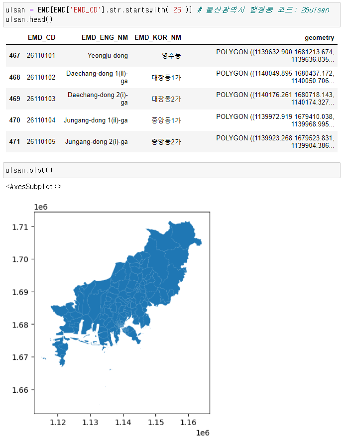 ulsan = EMD[EMD['EMD_CD'].str.startswith('26')] # 울산광역시 행정동 코드: 26ulsan