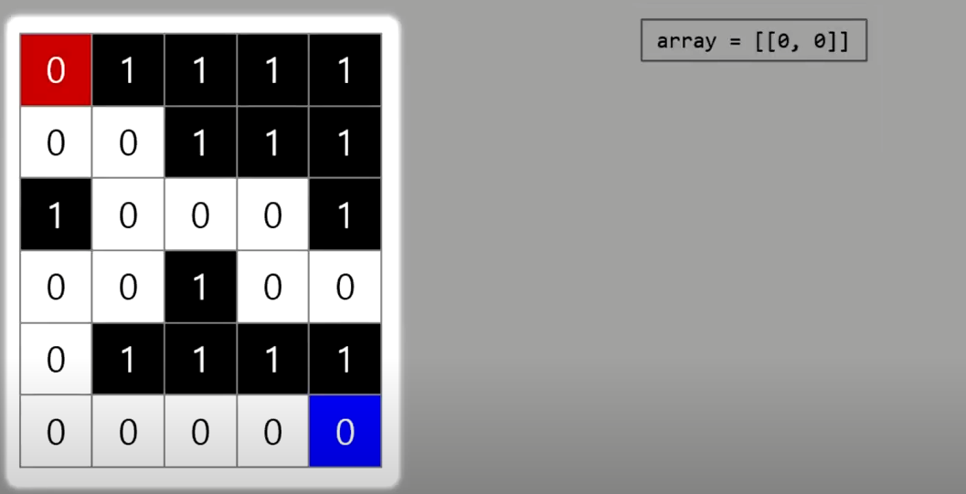 먼저 [0,0] 을 올라 타고 array에 [0,0] 을 넣어준다. 그 뒤 해당 좌표에는 -1 값으로 변경하고 array에서 없애줌