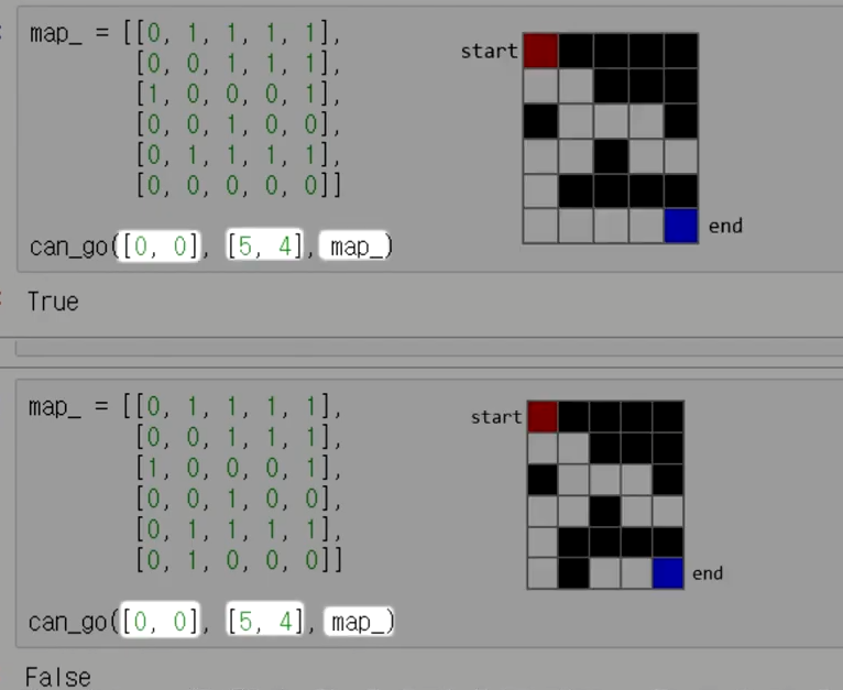 - 미로가 처음과 끝이 이어진 길인지(목적지 까지 갈 수 있는가)