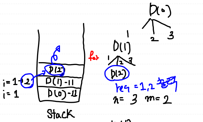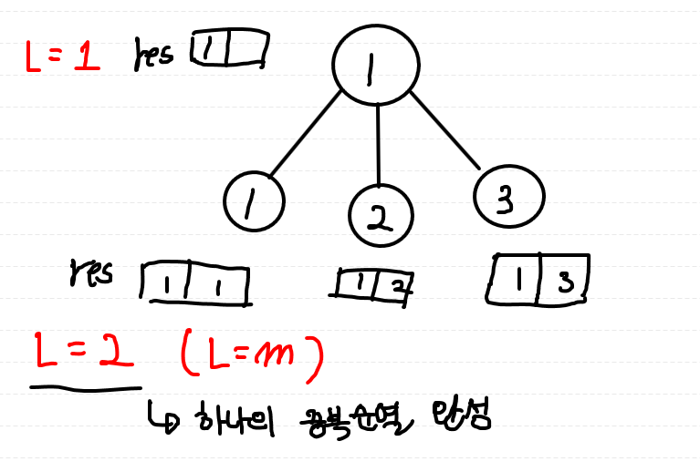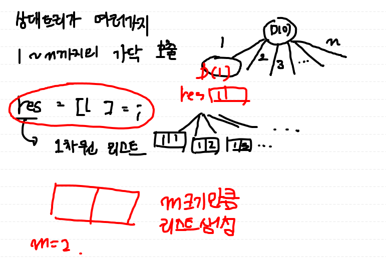 이런 식으로 m의 크기만큼 중복 순열을 저장하며 DFS를 돌 수 있게 만듦