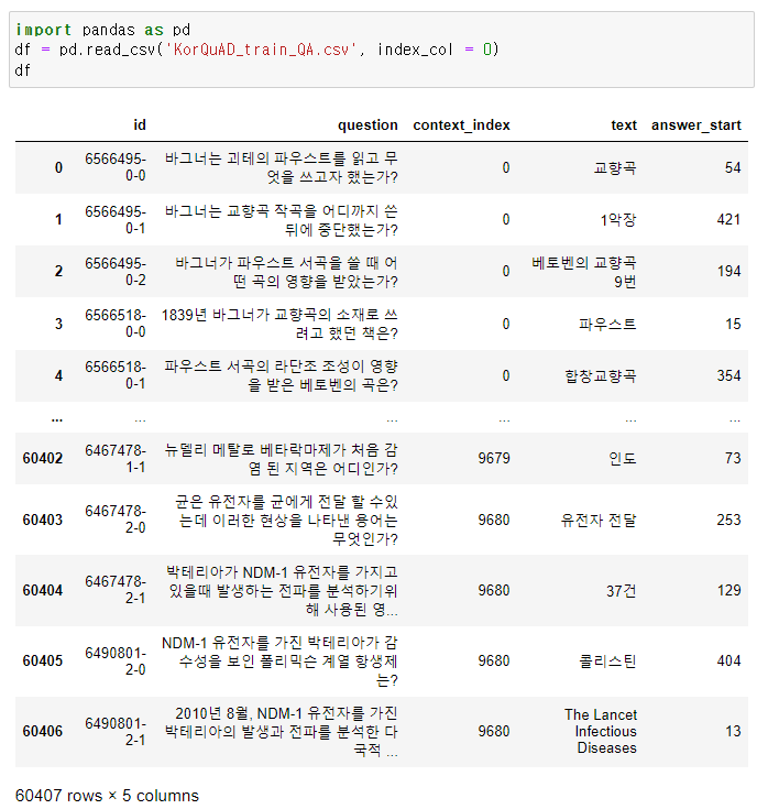 | [NLP] KorQuAD 데이터를 활용해보자 ( KorQuAD 1.0 csv file) (0) | 2022.10.12 |