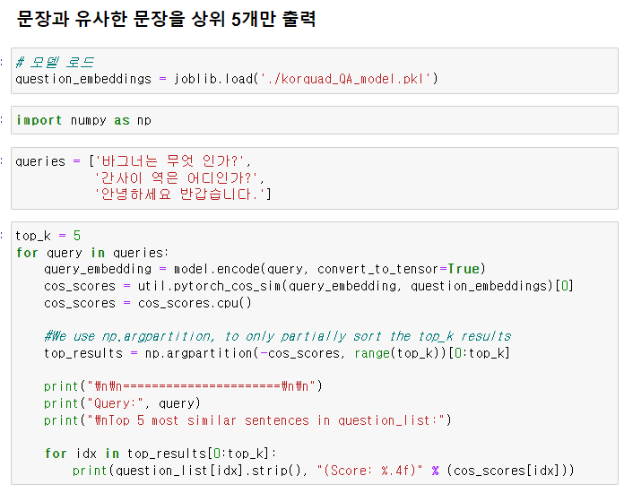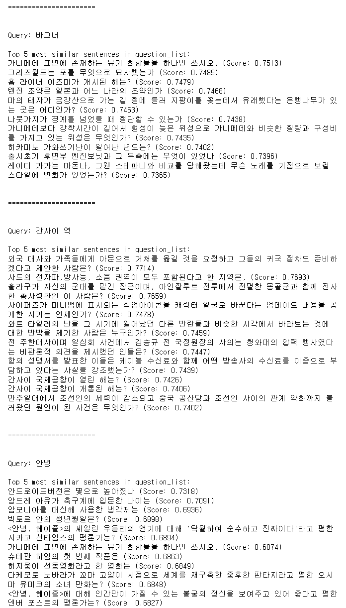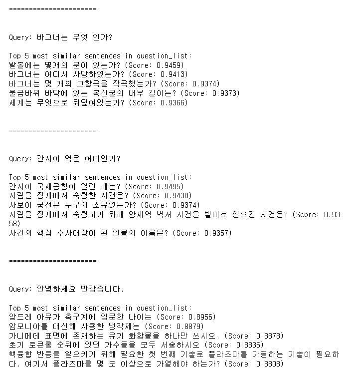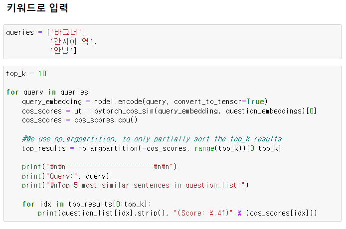 입력한 문장과 유사한 문장을 출력해보겠습니다.