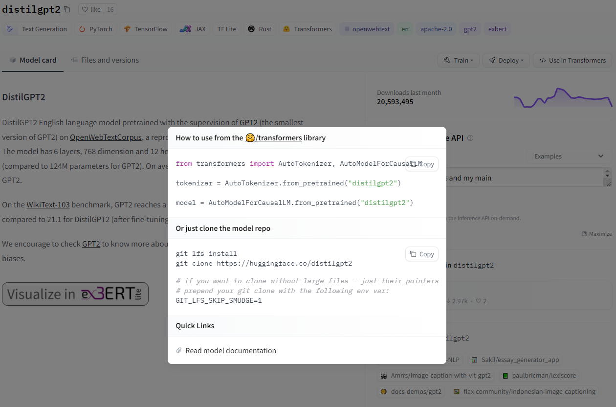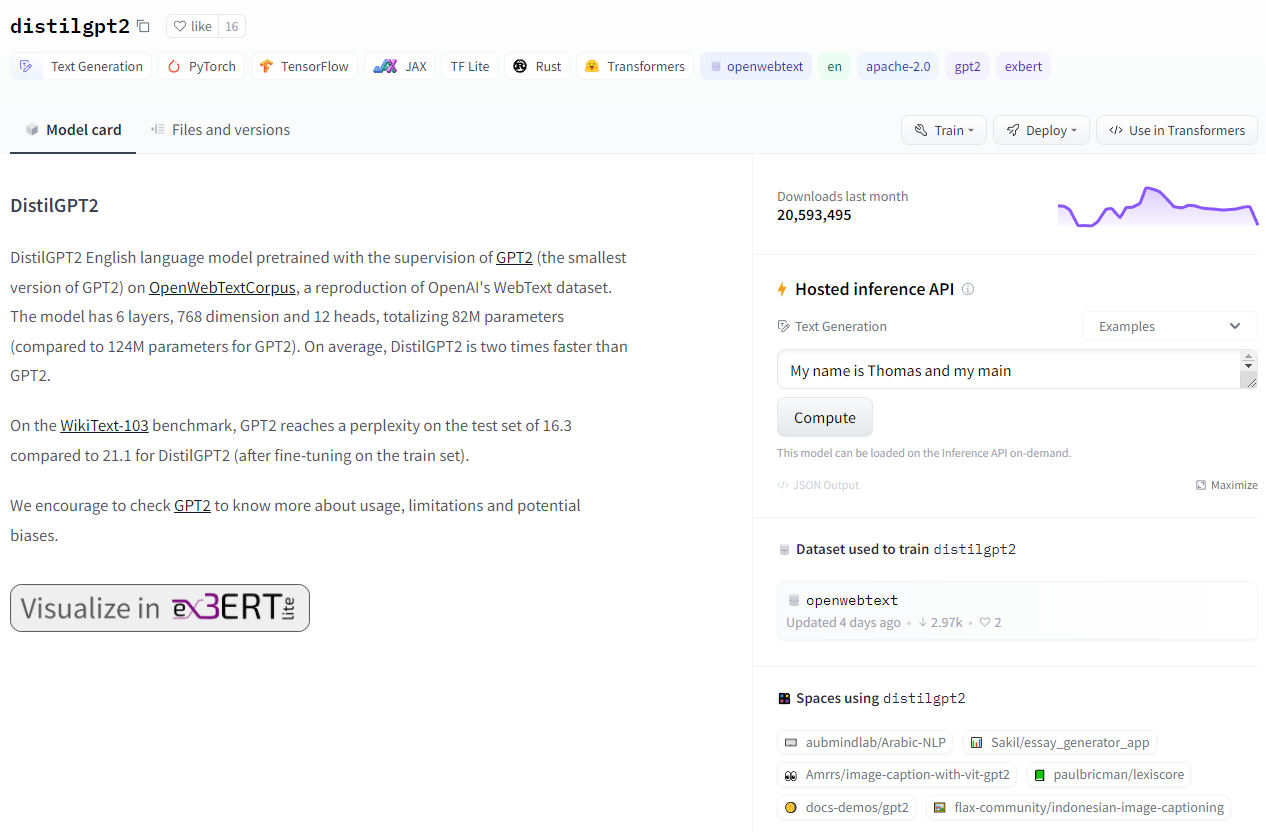 오른쪽의 Train, Depoly, Use in Transformers 등의 버튼을 통해