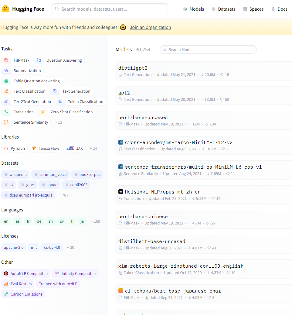 Hugging Face의 Models 탭을 통해 활용가능한 모델들을 확인할 수 있고