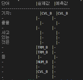 print("{:15}|{:5}|{}".format("단어","실제값","예측값"))
