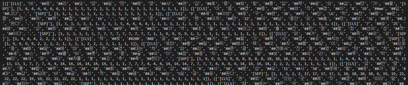 [(['[CLS]', '비', '##토', '##리', '##오', '양', '##일', '만', '##에', '영', '##사', '##관', '감', '##호', '용', '##퇴', '항', '##룡', '압', '##력', '##설', '의', '##심', '##만', '가', '##율', '[SEP]'], [1, 4, 4, 4, 4, 6, 6, 1, 1, 5, 5, 5, 2, 2, 1, 1, 1, 1, 1, 1, 1, 1, 1, 1, 1, 1, 1]), (['[CLS]', '이', '음', '##경', '##동', '##맥', '##의', '직', '##경', '##이', '8', '19', '##mm', '##입', '##니다', '.', '[SEP]'], [1, 1, 1, 1, 1, 1, 1, 1, 1, 1, 3, 3, 3, 3, 3, 1, 1]), (['[CLS]', '9', '##세', '##이브', '##로', '구', '##완', '30', '##위', '##인', 'LG', '박', '##찬', '##형', '##은', '평', '##균', '##자', '##책', '##점', '##이', '16', '.', '45', '##로', '준', '##수', '##한', '편', '##이지', '##만', '22', '##이', '##닝', '동안', '피', '##홈', '##런', '##이', '31', '##개', '##나', '된다', '.', '[SEP]'], [1, 3, 3, 3, 3, 1, 1, 3, 3, 3, 5, 4, 4, 4, 4, 1, 1, 1, 1, 1, 1, 3, 3, 3, 3, 1, 1, 1, 1, 1, 1, 3, 3, 3, 1, 1, 1, 1, 1, 3, 3, 3, 1, 1, 1]), (['[CLS]', '7', '##승', '25', '##패', '##는', '상', '##트', '##페', '##테', '##르', '##부', '##르', '##크', '##가', '역', '##대', '월', '##드', '##리그', '##에', '출', '##진', '##한', '분', '##별', '최', '##선의', '성', '##적', '##이다', '.', '[SEP]'], [1, 3, 3, 3, 3, 3, 7, 7, 7, 7, 7, 7, 7, 7, 7, 1, 1, 9, 9, 9, 9, 1, 1, 1, 1, 1, 1, 1, 1, 1, 1, 1, 1]), (['[CLS]', '퍼', '##거', '##슨', '씨', '##족', '##의', '꾀', '[SEP]'], [1, 4, 4, 4, 2, 2, 2, 1, 1]), (['[CLS]', '유', '##로', '##200', '##8', '공', '##인', '##구', '##가', '변', '##할', '기', '##록', '시', '##정', '##조', '##치는', '죽', '##을', '맛', '[SEP]'], [1, 9, 9, 9, 9, 2, 2, 2, 2, 1, 1, 1, 1, 2, 2, 2, 2, 1, 1, 1, 1]), (['[CLS]', '로마', '##올', '##림', '##픽', '##에서', '육', '##미', '##지', '##황', '##탕', '이', '##남', '##지', '##역', '##으로', '동', '##메', '##달', '##에', '머', '##문', '추', '##경', '##대는', '차', '##년', '파', '##리', '##오', '##픈', '결', '##승', '##전에서', '진', '동', '##영', '##의', '탄', '##셰', '차', '##우', '##세', '##스', '##쿠', '##를', '비', '##롯', '##해', '몽', '##골', '##의', '이', '##창', '##동', '차', '##간', '##바', '발', '##보', '##나', '##의', '리', '##자', '##루', '##드', '박', '##혜', '##미', '##셔', '좌', '##타', '##자를', '놓', '##고', '추', '##축', '##한다', '.', '[SEP]'], [1, 9, 9, 9, 9, 9, 8, 8, 8, 8, 8, 18, 18, 18, 18, 18, 2, 2, 2, 2, 1, 1, 4, 4, 4, 6, 6, 9, 9, 9, 9, 13, 13, 13, 1, 7, 7, 7, 4, 4, 14, 14, 14, 14, 14, 14, 1, 1, 1, 7, 7, 7, 4, 4, 4, 14, 14, 14, 7, 7, 7, 7, 4, 4, 4, 4, 14, 14, 14, 14, 2, 2, 2, 1, 1, 1, 1, 1, 1, 1]), (['[CLS]', '금', '##반', '명', '##기', '통', '##합', '##우', '##승', '24', '10', '##회', '##차', '##는', '8일', '상', '##오', '6', '##시', '50', '##분', '상', '##오', '11', '##시', '50', '##분에', '발', '##태', '##가', '끝', '##마', '##감', '##되며', '비', '##공', '##식', '적', '##중', '##결', '##과', '##는', '5일', '공', '##표', '##된다', '.', '[SEP]'], [1, 1, 1, 2, 2, 17, 17, 17, 17, 3, 10, 10, 10, 10, 6, 19, 19, 22, 22, 22, 22, 19, 19, 22, 22, 22, 22, 1, 1, 1, 1, 1, 1, 1, 1, 1, 1, 1, 1, 1, 1, 1, 6, 1, 1, 1, 1, 1]), (['[CLS]', '권', '##뢰', '##가', '있는', '곳', '##에', '직', '##경', '##에', '따라', '달', '##라', '##지는', '##데', '##요', '.', '[SEP]'], [1, 1, 1, 1, 1, 1, 1, 1, 1, 1, 1, 1, 1, 1, 1, 1, 1, 1]), (['[CLS]', '때', '##로는', '##은', '귀', '##여', '##운', '가', '##스', '##나', '##기', '##인', '비', '##담', '세', '##상', '##일', '##에는', '무', '##관', '##심', '.', '[SEP]'], [1, 1, 1, 1, 1, 1, 1, 1, 1, 1, 1, 1, 1, 1, 1, 1, 1, 1, 1, 1, 1, 1, 1])]