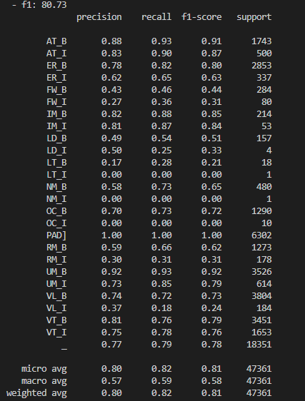 label_dict = {'PER_B': 0, 'DAT_B': 1, '-': 2, 'ORG_B': 3, 'CVL_B': 4, 'NUM_B': 5, 'LOC_B': 6, 'EVT_B': 7, 'TRM_B': 8, 'TRM_I': 9, 'EVT_I': 10, 'PER_I': 11, 'CVL_I': 12, 'NUM_I': 13, 'TIM_B': 14, 'TIM_I': 15, 'ORG_I': 16, 'DAT_I': 17, 'ANM_B': 18, 'MAT_B': 19, 'MAT_I': 20, 'AFW_B': 21, 'FLD_B': 22, 'LOC_I': 23, 'AFW_I': 24, 'PLT_B': 25, 'FLD_I': 26, 'ANM_I': 27, 'PLT_I': 28, '[PAD]': 29}