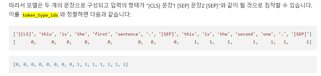 # 'token_type_ids' ( [CLS]와 [SEP]를 구분해줌 )