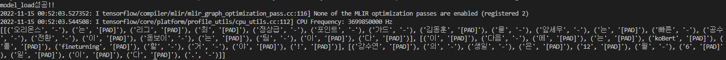 [[('오리온스', '-'), ('는', '[PAD]'), ('리그', '[PAD]'), ('최', '[PAD]'), ('정상급', '-'), ('포인트', '-'), ('가드', '-'), ('김동훈', '[PAD]'), ('을', '-'), ('앞세우', '-'), ('는', '[PAD]'), ('빠른', '-'), ('공수', '-'), ('전환', '-'), ('이', '[PAD]'), ('돋보이', '-'), ('는', '[PAD]'), ('팀', '-'), ('이', '[PAD]'), ('다', '[PAD]')], [('이', '[PAD]'), ('다음', '-'), ('에', '[PAD]'), ('는', '[PAD]'), ('koBert', '[PAD]'), ('를', '[PAD]'), ('fineturning', '[PAD]'), ('할', '-'), ('거', '-'), ('야', '[PAD]'), ('!', '[PAD]')], [('강수연', '[PAD]'), ('의', '-'), ('생일', '-'), ('은', '[PAD]'), ('12', '[PAD]'), ('월', '-'), ('6', '[PAD]'), ('일', '[PAD]'), ('이', '[PAD]'), ('다', '[PAD]'), ('.', '-')]]