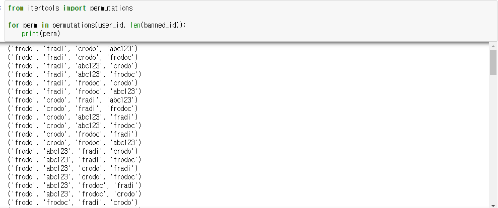 구한 조합에서 banned_id 의 형태와 맞는지 필터링 하는 작업을 거쳐야한다.