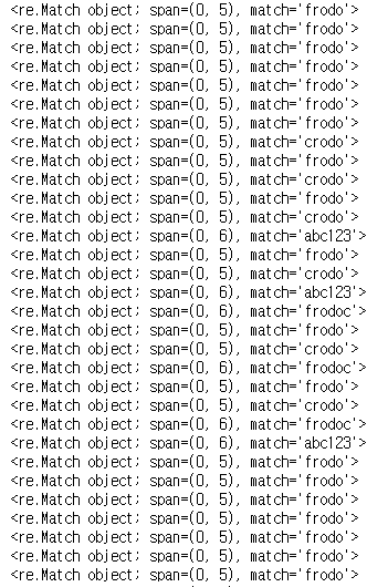 re.search("c", "abcdef") # <re.Match object; span=(2, 3), match='c'>
