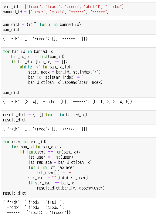 banned_id 리스트와 lst 리스트를 비교하며 해당 문자가 일치한지 검사함, 그리고 문자열의 길이가 같은지도 검사 (조건문)