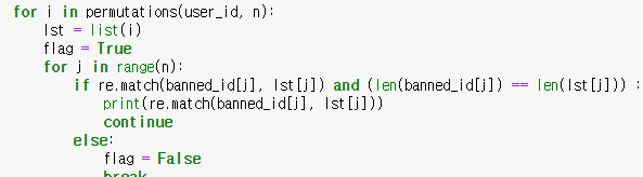 구한 조합에서 banned_id 의 형태와 맞는지 필터링 하는 작업을 거쳐야한다.
