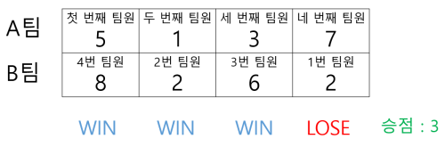 - 각 경기당 A팀에서 한 사원이, B팀에서 한 사원이 나와 서로의 수를 공개합니다. 그때 숫자가 큰 쪽이 승리하게 되고, 승리한 사원이 속한 팀은 승점을 1점 얻게 됩니다.