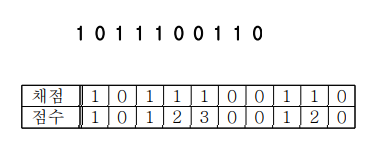 예를 들어, 아래와 같이 10 개의 OX 문제에서 답이 맞은 문제의 경우에는 1로 표시하고, 틀린 경 우에는 0으로 표시하였을 때, 점수 계산은 아래 표와 같이 계산되어, 총 점수는 1+1+2+3+1+2=10 점이다.