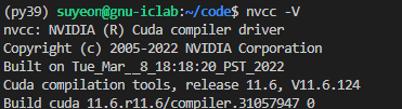 파이토치 버전 뒤에 +cu116 과 같이 쿠다 버전이 적혀야한다