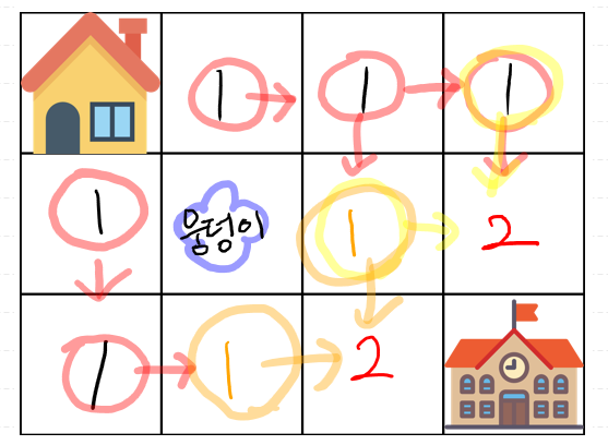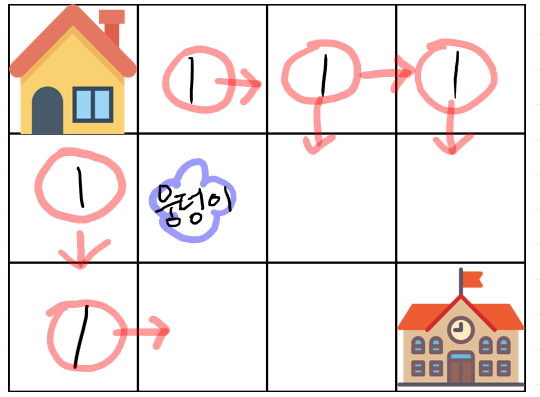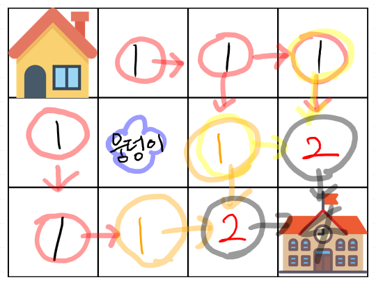 여기서 '물웅덩이' 라는 제약 조건이 좀 까다로운데, 일단 이동할 수 있는 방향은 오른쪽과 아래쪽으로만 가능하다.