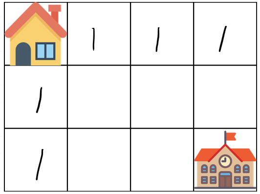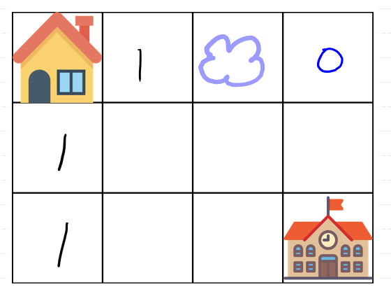 - 집과 학교가 물에 잠긴 경우는 입력으로 주어지지 않습니다.