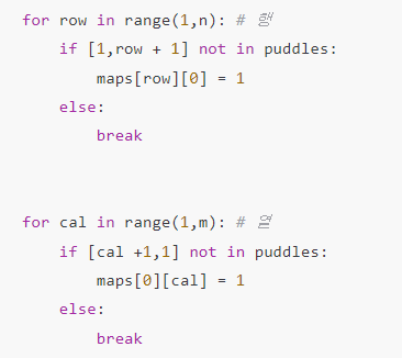 먼저 map을 만들어 좌표를 구현할 수 있게 한다. 그리고 물 웅덩이가 없는 첫번째 행과 첫번째 열에 1을 적어주고