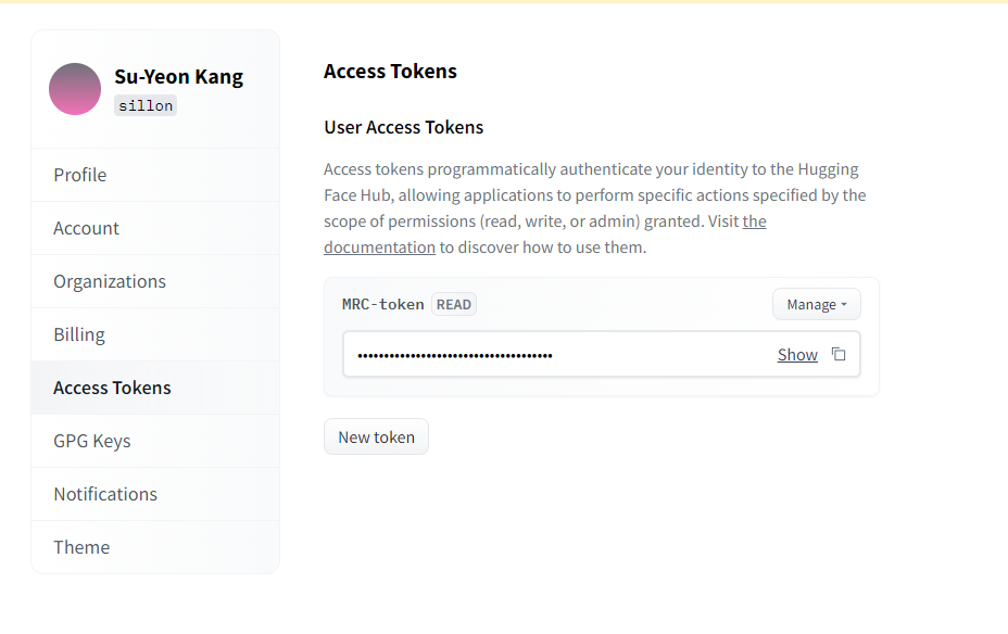 내 모델을 코드창에서 바로 올리기위해 허깅페이스에 로그인하려면 토큰을 발급받아야한다.