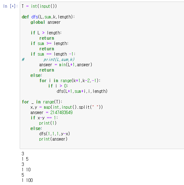 입력의 첫 줄에는 테스트케이스의 개수 T가 주어진다. 각각의 테스트 케이스에 대해 현재 위치 x 와 목표 위치 y 가 정수로 주어지며, x는 항상 y보다 작은 값을 갖는다. (0 ≤ x < y < 231)