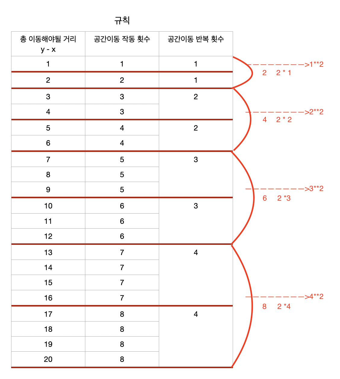 총 이동 거리: 2, 6, 12, 20.... <-빨간 경계선 바로 위 숫자들