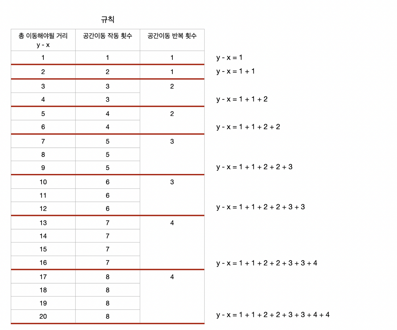 김우현을 위해 x지점부터 정확히 y지점으로 이동하는데 필요한 공간 이동 장치 작동 횟수의 최솟값을 구하는 프로그램을 작성하라.