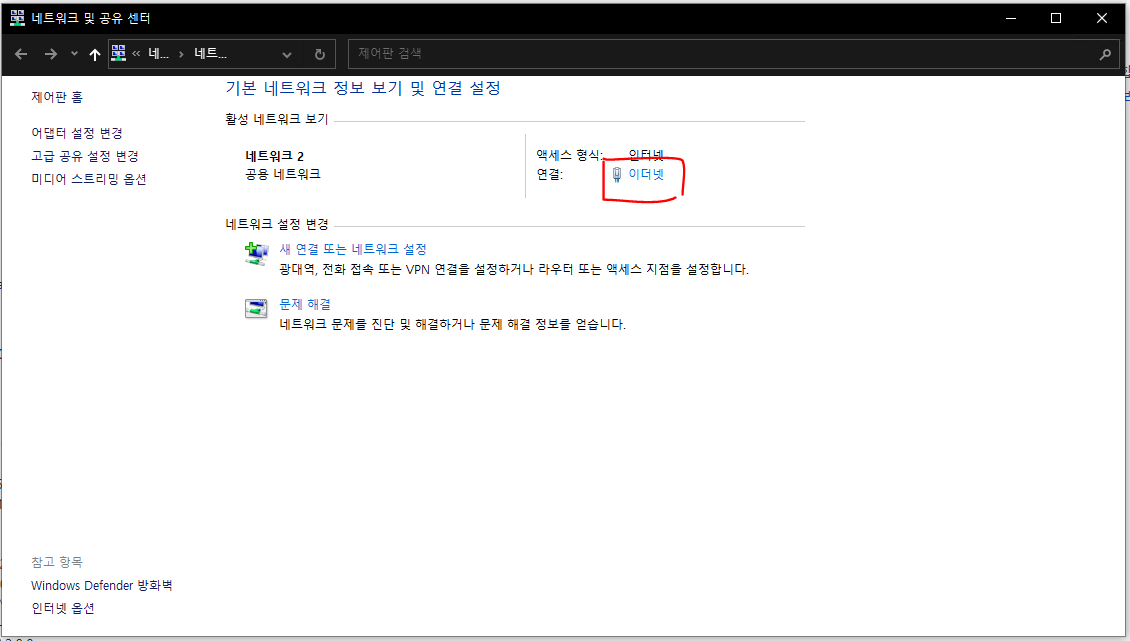 1. 네트워크 및 공유 센터에서 이더넷을 클릭합니다.