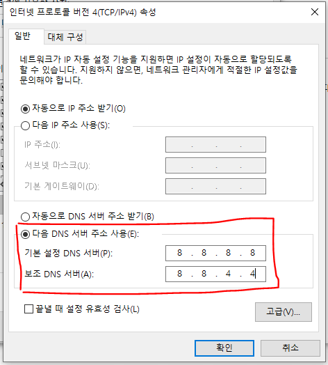 4. 다음 DNS 서버 주소를 Google DNS 서버 IP 주소로 변경합니다. 8.8.8.8 and/or 8.8.4.4.