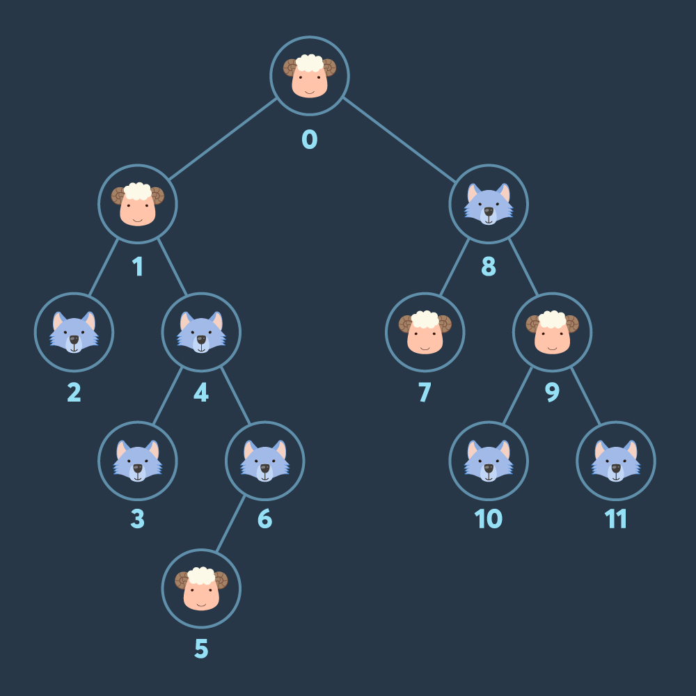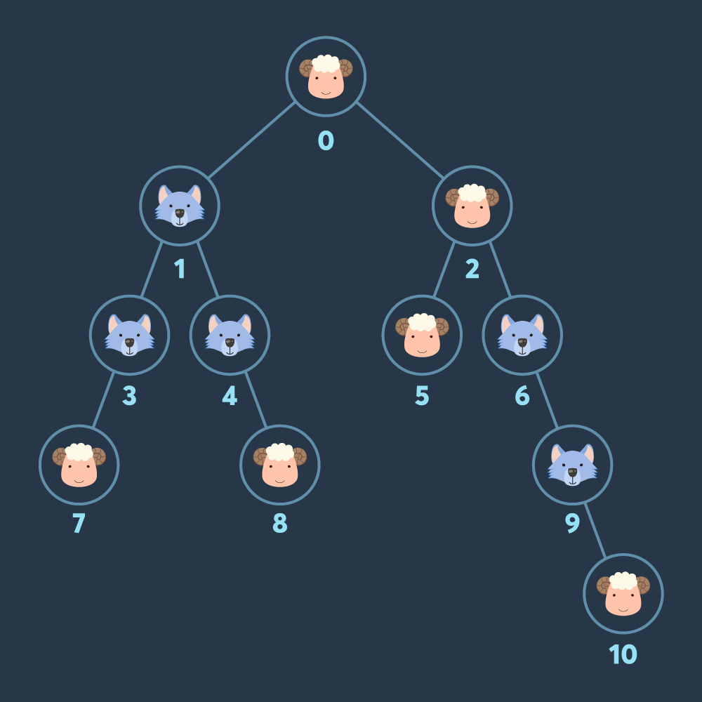 2진 트리 모양 초원의 각 노드에 늑대와 양이 한 마리씩 놓여 있습니다. 이 초원의 루트 노드에서 출발하여 각 노드를 돌아다니며 양을 모으려 합니다. 각 노드를 방문할 때 마다 해당 노드에 있던 양과 늑대가 당신을 따라오게 됩니다. 이때, 늑대는 양을 잡아먹을 기회를 노리고 있으며, 당신이 모은 양의 수보다 늑대의 수가 같거나 더 많아지면 바로 모든 양을 잡아먹어 버립니다. 당신은 중간에 양이 늑대에게 잡아먹히지 않도록 하면서 최대한 많은 수의 양을 모아서 다시 루트 노드로 돌아오려 합니다.
