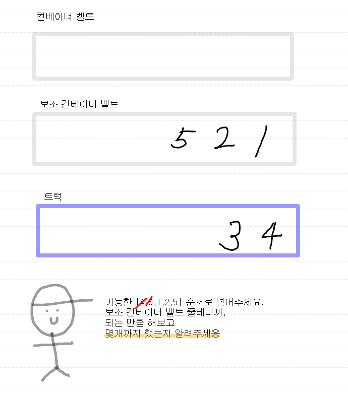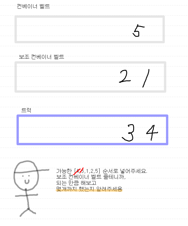 - 모든 상자를 보조 컨테이너 벨트에 모두 넣고, 역순으로 하나씩 빼서 트럭에 싣습니다.