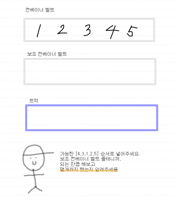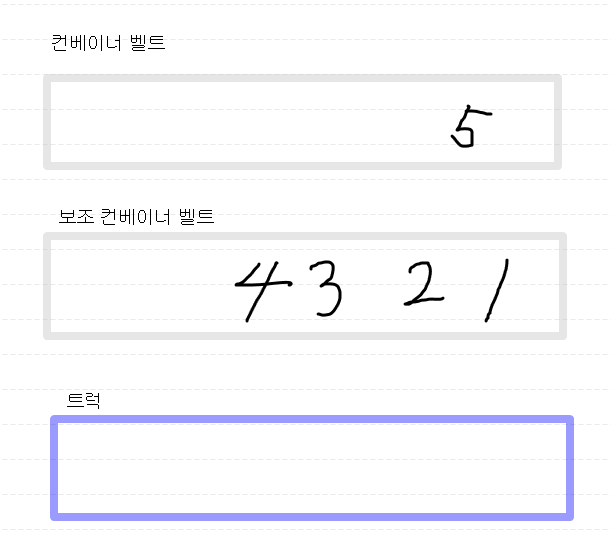 그럼 보조 컨베이너 벨트에 일단 넣어보고, 보조 컨베이너 벨트의 마지막에 있는 상자가 우리가 넣고자 하는 순서이면 빼줍시다.