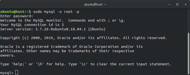 아래의 명령어로 MySQL 서버에 접속합니다. 그리고 입력한 패스워드를 입력합니다.