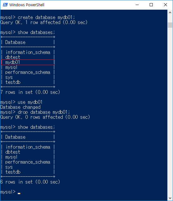 #데이터베이스 생성 mysql> create database dbname; # 현재 존재하는 데이터베이스 목록을 보여준다. mysql> show databases; # 특정 데이터베이스를 사용하겠다고 선언한다. mysql> use dbname; # 데이터베이스 삭제 mysql> drop database dbname; |