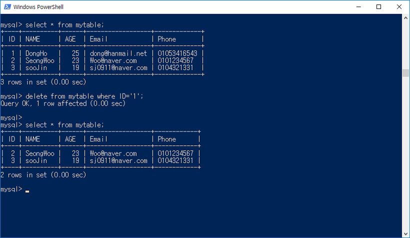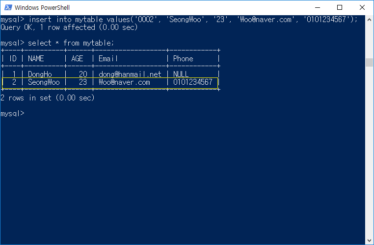 mysql> insert into tablename values(값1, 값2, ...); or mysql> insert into tablename (col1, col2, ...) values(값1, 값2, ...); |