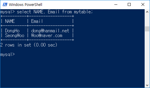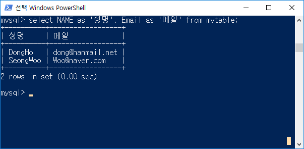 mysql> SELECT col1 AS '성명' col2 AS '메일' FROM tablename; |