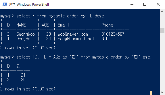 mysql> SELECT * FROM tablename ORDER BY col1 DESC; mysql> SELECT col1, ID + AGE AS '합' FROM tablename ORDER BY '합' ASC; |