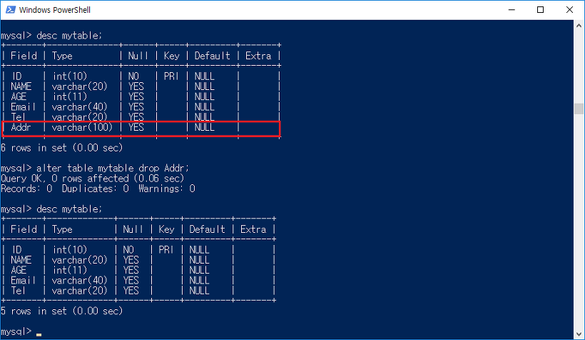 | mysql> ALTER TABLE 테이블명 DROP 삭제할 칼럼명; |