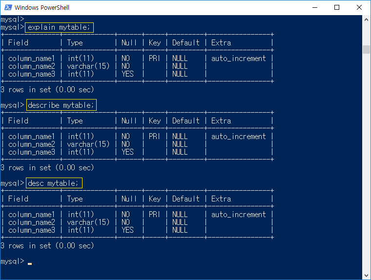 | mysql> explain tablesname; or mysql> describe tablename; or mysql> desc tablename; |