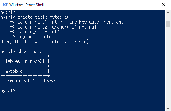 # 테이블 생성 mysql> create table tablename( column_name1 int primary key auto_increment, column_name2 varchar(15) not null, column_name3 int ) engine=innodb; or mysql> create table tablename( ID int(10) primary key not null, NAME varchar(20), AGE int); |