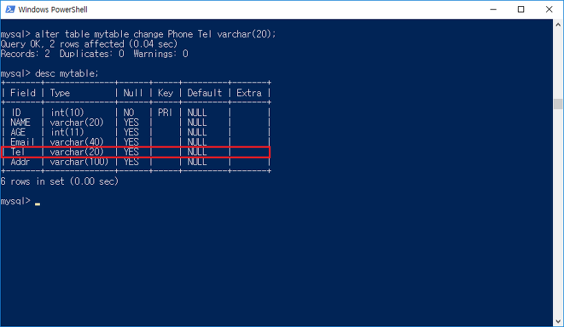 mysql> ALTER TABLE 테이블명 CHANGE 수정할칼럼명 수정된칼럼명 칼럼타입; |