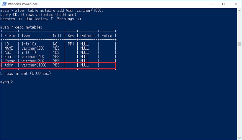 | mysql> ALTER TABLE 테이블명 ADD 추가할칼럼명 칼럼타입; |