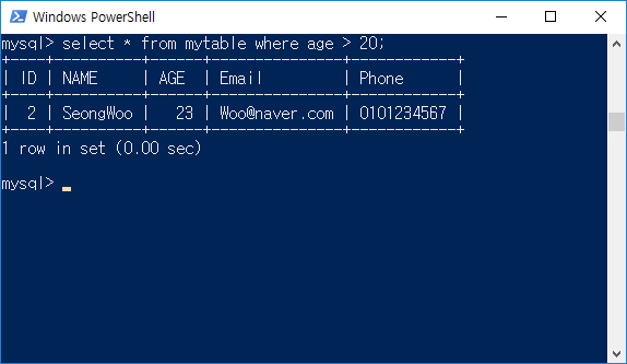 mysql> SELECT * FROM 테이블명 WHERE 조건; |
