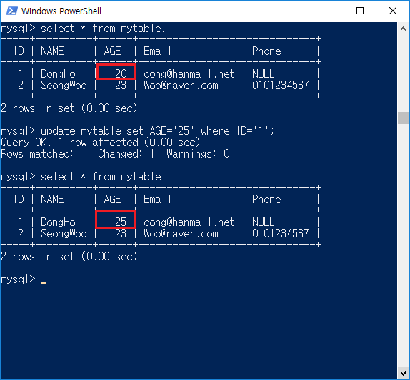 실습 : ID = '1' 에 해당하는 AGE를 25로 수정