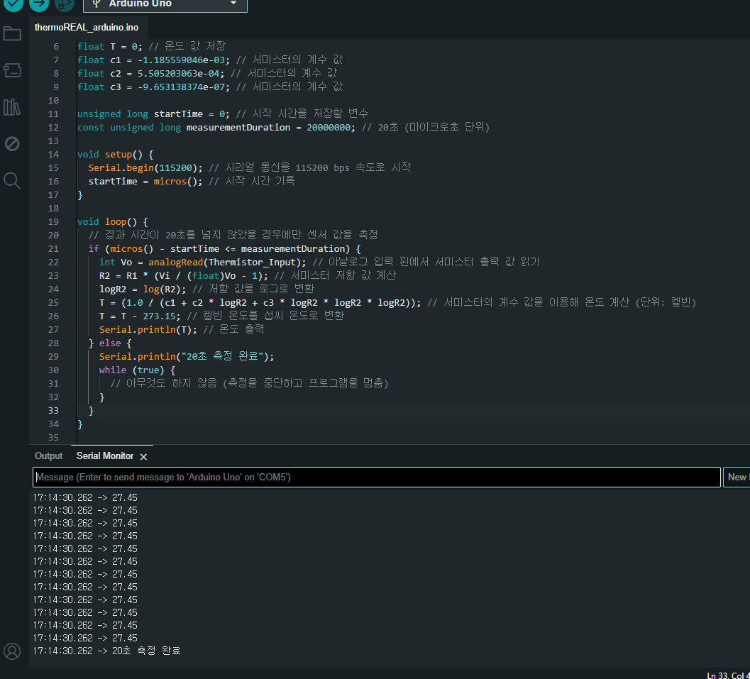 해당 코드는 thermistor 센서를 통해 계속해서 아두이노로 온도 정보가 전송되고있다.