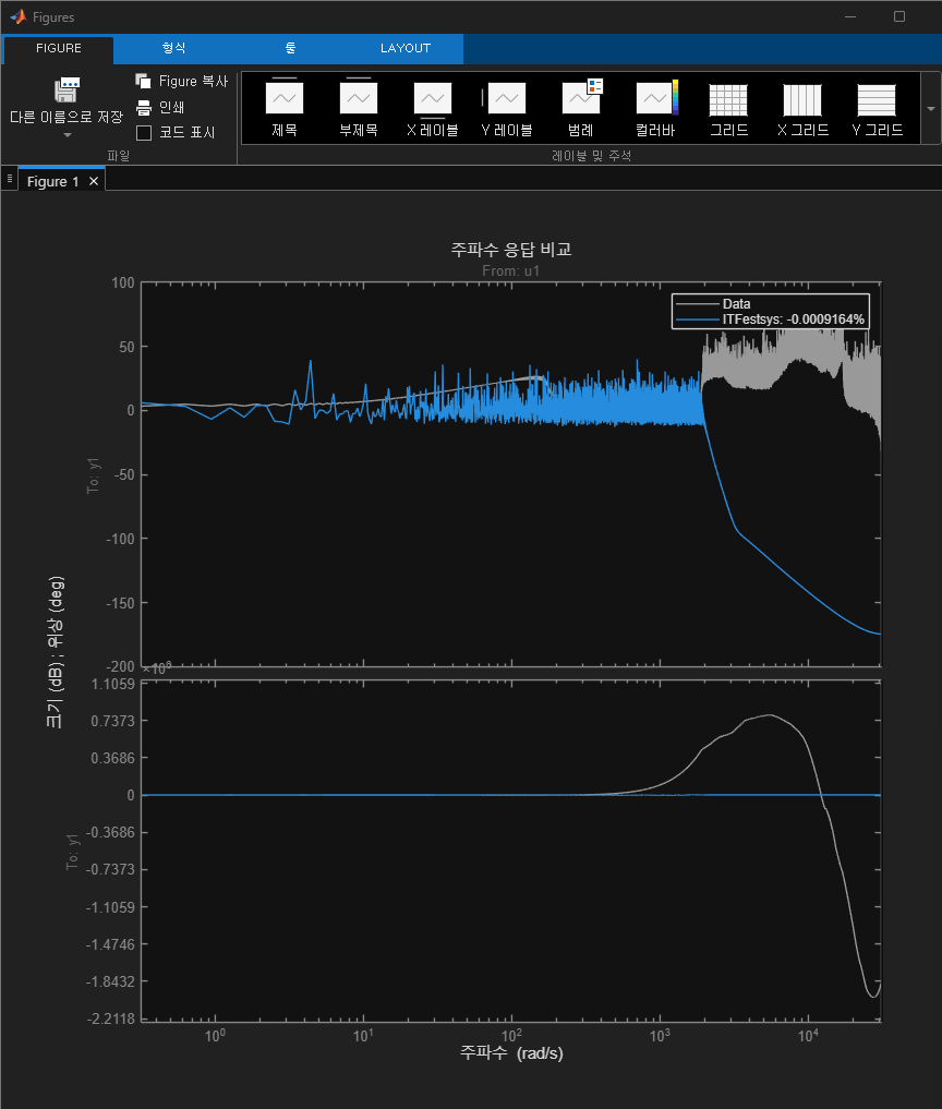 현재 MATLAB의 compare(ITFestsys, EstimatedITF);에서 나타난 파란색(측정된 ITF)과 회색(추정된 ITF) 그래프가 겹쳐져야 한다.