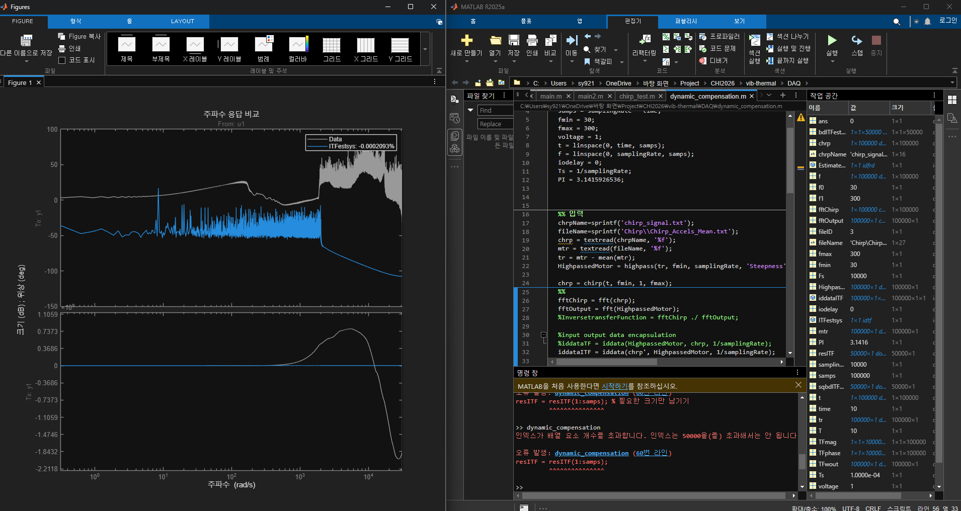 - 현재 compare(ITFestsys, EstimatedITF);의 결과에서 회색(추정값)과 파란색(실제 측정값)이 일치하도록 조정해야 한다.