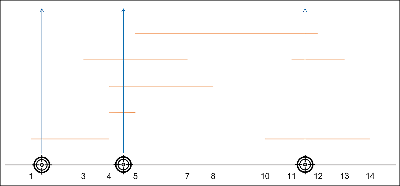 - 이는 한 폭격 미사일의 x 좌표 범위를 나타내며, 개구간 (s, e)에서 요격해야 합니다.